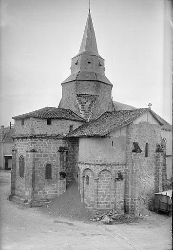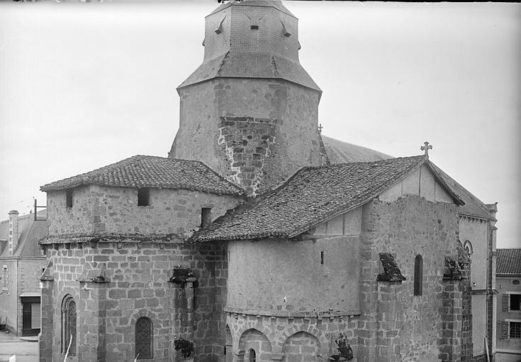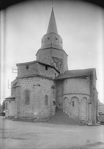 Edifice du 12e siècle ayant subi un certain nombre de transformations. La nef a été refaite, hormis la travée voisine du transept nord et deux contreforts côté sud. La sacristie accolée au transept dans son mur oriental, est récente. Les deux absides ont été surélevées au 17e siècle pour la défense. Labside à trois pans est couverte dune voûte à la disposition particulière. Celle-ci est cylindrique dans la partie droite du choeur, en trône de cône. Faisant suite au cylindre, au-dessus des deux pans latéraux et dans le fond du chevet, le mur sélève verticalement jusquau trône de cône quelle limite.