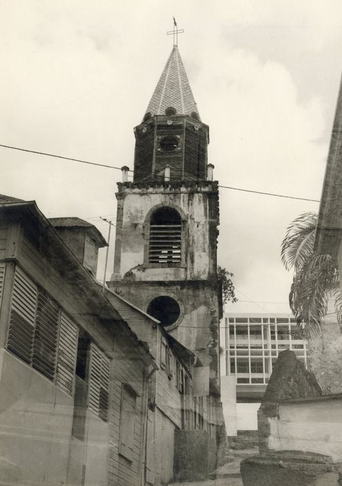 La première chapelle fut érigée en 1673 par les frères capucins. En 1713, elle devient église paroissiale. En 1730, elle est reconstruite. En 1749, le plan de l'ingénieur Buy figure un bâtiment carré à proximité, première trace d'un clocher. Désaffectée pendant la Révolution, l'église est rendue au culte en 1802. Après les destructions dues au cyclone de 1825, de nombreuses reconstructions ont lieu dans les années 1830. Le clocher a été construit en 1837, puis agrandi entre 1875 et 1889. Il est construit sur une base octogone sur laquelle repose un fût carré. Au premier niveau se trouve un oculus, sans doute trace d'une horloge aujourd'hui disparue. Au troisième niveau, les cloches sont dans un campanile surmonté d'une flèche dans la toiture en écailles de tôle peinte.