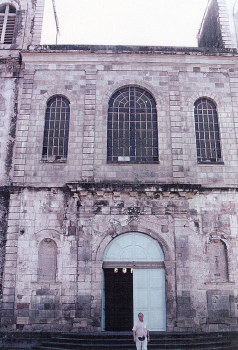 La première mention connue relative à la construction d'une église au quartier du Mouillage date de 1654. Elle s'inscrit dans le cadre de la création d'un monastère Dominicain par le Père Boulogne. Faisant au départ office de chapelle privée, l'église attire rapidement beaucoup de fidèles. C'est d'abord une chapelle puis une église paroissiale après la délimitation des paroisses de Saint-Pierre. A la suite du bombardement anglais de la rade de Saint-Pierre en 1667, la chapelle et son clocher sont ruinés. Une reconstruction est envisagée, et en 1675, les officiers de la flotte du Roy sont sollicités avec leurs matelots et sans doute l'aide des paroissiens. Il faut attendre 1816, pour qu'une assemblée paroissiale indignée par l'absence d'un clocher décide d'en voter la construction. En 1851, l'église du Mouillage est érigée en cathédrale à l'arrivée du premier évêque, Mgr Leherpeur. En effet, le 18 décembre 1850, par une bulle du pape Pie IX, la Martinique est érigée en diocèse. Le siège épiscopal devait être établi à Fort-de-France mais Monseigneur Le Herpeur fait le choix de résider à Saint-Pierre et une bulle papale du 12 mai 1853 le nomme évêque de Saint-Pierre et de Fort-de-France. Trop exiguë, l'église est agrandie de juillet 1855 à décembre 1856. En 1856, le trône de l'évêque et 20 stalles sont installés. Les deux tourelles et le clocher sont élevées en 1885 à l'instigation de P. Cudennec, curé de la cathédrale. A partir de cette date, la façade ne subit plus de changements importants jusqu'à l'éruption. En revanche, l'intérieur reçoit de nombreux aménagements et décorations. L'éruption de 1902 détruit en grande partie l'édifice. Toutefois, le premier niveau du massif antérieur, le sol et une partie du parvis résistent à la catastrophe. D'après le journal La Paix, une chapelle provisoire est construite dans les ruines en attendant la reconstruction. Sous l'impulsion de Monseigneur Lequien, d'importants travaux sont entrepris dès 1923, sous la direction de l'architecte Touin. Un " comité pour la reconstruction de l'ancienne cathédrale de Saint-Pierre " est créé le 14 mars 1924. La cathédrale est reconstruite sur les bases de l'ancienne principalement entre 1924 et 1926 grâce aux fonds de donateurs, en particulier Victor Depaz, président du comité. En 1925, la cathédrale reçoit de nouvelles cloches. Les travaux se poursuivent jusqu'en 1929, période de la deuxième série d'éruptions, où les travaux cessent jusqu'en 1932. Malgré son apparence d'édifice en pierre, la structure de la cathédrale est en " ciment armé ", selon les plans de l'ingénieur Croquet. C'est d'ailleurs l'une des premières réalisations en béton armé de Martinique. En 1934, 175.000f sont alloués par la contribution nationale au " comité pour la reconstruction de l'ancienne cathédrale de Saint-Pierre ", pour des réparations. L'entretien de la cathédrale n'entre pas dans le budget municipal, mais l'édifice dont le conseil municipal reconnaît les valeurs historique et architecturale, et l'intérêt touristique, bénéficie de subventions et autres allocations de la commune. Des sommes sont allouées à la société diocésaine de Martinique, notamment pour l'achèvement du clocher en 1950, pour l'aménagement intérieur en 1956 ou pour des travaux d'embellissement en 1965. Le remarquable autel en marbre blanc de l'ancienne cathédrale, transporté à Paris, au musée de Cluny, ne revient à la Martinique qu'en 1939. La municipalité prend également en charge le transfert d'un bourdon (?) de Fort-de-France à Saint-Pierre à l'occasion du cinquantenaire de la catastrophe. En 1979, elle organise le rapatriement de la cloche de la cathédrale qui se trouve dans les réserves du musée du Vatican avec comme objectif son exposition dans un édicule. Le transfert a lieu en 1981, la cloche est fendue (le conseil municipal attribue cette cassure au transport, elle est en fait due à l'éruption). Il s'agit en fait d'une cloche de Saint-Etienne du centre, elle est exposé au musée Frank A. Perret.