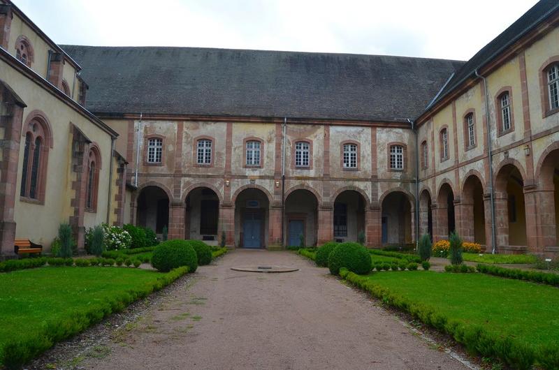 Etablissement monastique créé vers 640, comprenant une église circulaire dont il ne subsistait, au 18e siècle, que la partie hémisphérique transformée en choeur. L'ensemble de l'établissement a subi d'importantes modifications entre 1680 et 1720. L'église se trouve au sud du cloître qui se développe autour du jardin, les communs et le logis abbatial. Au 18e siècle, le cloître, construit en grès rose enduit, était de plan carré, se composait de quatre galeries à arcades et utilisait le pilastre toscan. Deux ailes ont disparu : l'aile nord, détruite par l'incendie de l'église ; l'aile Est, occupée par la nouvelle église. L'église d'origine, détruite par un incendie en 1809, a été reconstruite par l'architecte Prosper Morey de 1866 à 1869, dans un style néo-médiéval. Le clocher, de plan octogonal, se compose d'un couronnement de dômes superposés. Le logis abbatial, de plan en L, a connu deux phases de construction : la partie sud entre 1728 et 1749 ; la partie nord vers 1763-1766. La grande salle, dite salle des abbés, a conservé l'essentiel de son décor d'origine (lambris, bibliothèque murale, cheminée de marbre). La cour des communs était largement ouverte sur les vergers et le potager. Les communs sont constitués par un bâtiment agricole au nord (1731) et la bibliothèque (1719). A partir de 1796, et jusqu'en 1981, l'installation d'une industrie textile occupe l'ensemble des bâtiments et dénature les intérieurs.