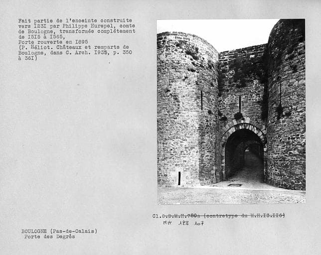 Fait partie des remparts de Boulogne sur Mer ; L'enceinte de la haute ville est inscrite avec le château d'Aumont 10 06 1926 (arrêté).