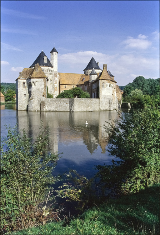 Façades et toitures du château et des bâtiments de la basse-cour ; tour nord du château ; sol de la cour du château et de la basse-cour ; douves en eau ou comblées ; pont reliant la basse-cour au château sur la parcelle AB 119 ; deux ponts et voie d'accès au château sur la parcelle AB 122 (cad. AB 117 à 122) : inscription par arrêté du 12 avril 1989