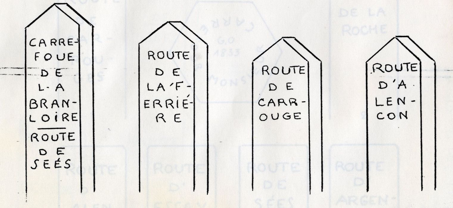 Après comparaison des cartes des 17e et 18e siècles, il semble que ces bornes ne soient pas antérieures à la réformation de la forêt réalisée par l'ingénieur Chaillou en 1772. Il s'agit d'une forme de signalisation archaïque. Chaque borne porte, gravée dans la pierre, le nom des carrefours et la direction des routes.£La seconde moitié du 18e siècle prend en compte scientifiquement le territoire sur lequel l'homme vit. Cartes et balisages systématiques du territoire ont été réalisés. Le balisage de la forêt d'Ecouves est l'un des rares témoins conservés des signalisations rationnelles mises en place.