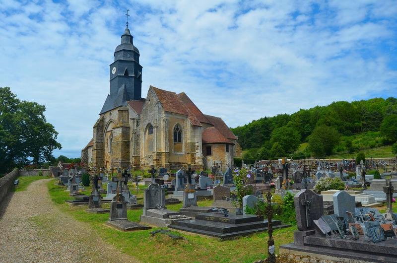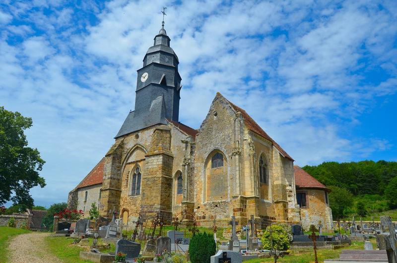 L'église fut longtemps désignée sous le nom de Notre-Dame-du-Mont-Harou. La partie la plus ancienne appartenait à l'abbaye de Moutiers et se retrouve dans les parties basses de l'église, et le portail à colonnes et chapiteaux. De la même époque apparaît également, au chevet de l'édifice, un bâtiment semi-circulaire qui a dû servir autrefois de chapelle. Des peintures murales remontant au 13e siècle ont été trouvées sur la voûte de cette pièce, le Christ étant entouré des Evangélistes et de leurs attributs. D'autres peintures peuvent remonter au 15e siècle. A l'extérieur, le côté nord remontant au 14e siècle est traité par un système de pignons axés perpendiculairement sur la nef centrale, selon une disposition fréquente dans les églises de la région pour la même époque. Le côté sud pourrait dater du 15e siècle, percé de fenêtres à meneaux ramifiés à la naissance de l'ogive.