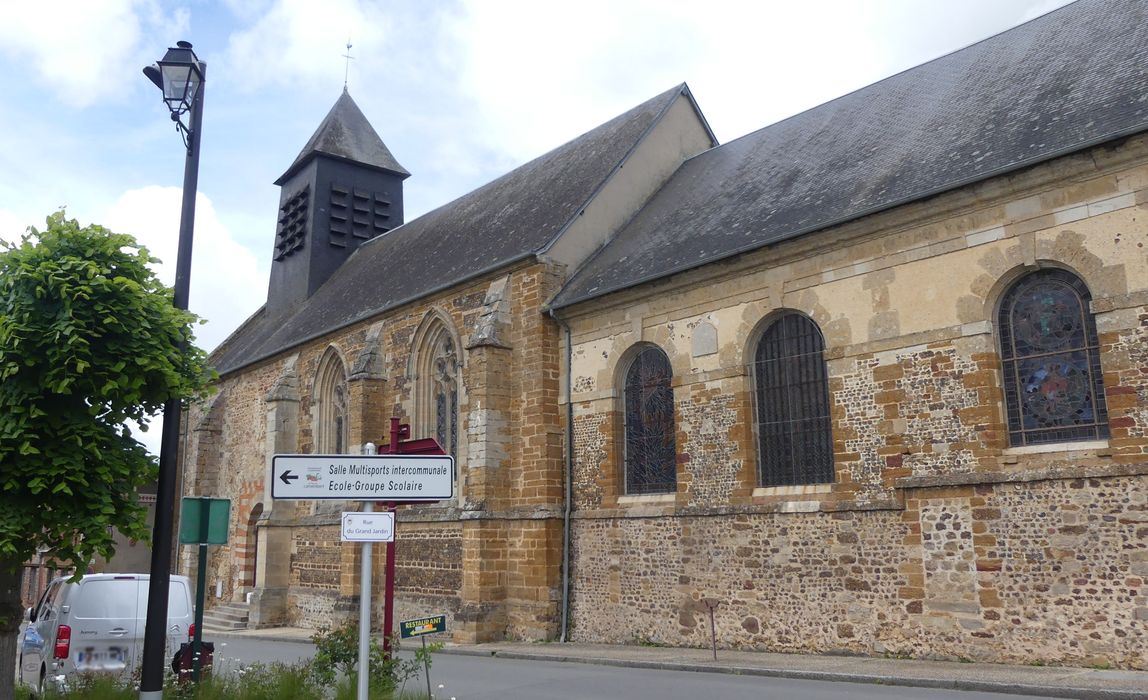 L'église avait été donnée par les Giroie à l'abbaye de Saint-Evroult en 1128. Elle fut brûlée quelques années plus tard, lors des luttes entre Etienne de Blois et Geoffroi Plantagenêt, comte d'Anjou. L'édifice actuel succède à l'édifice plus vaste du 13e siècle et aux remaniements dus aux destructions des guerres de Religion (1562). L'église comprend une nef dont la première travée supporte le clocher, et un choeur plus étroit terminé par un chevet plat. Une chapelle est accolée à la façade nord de la nef, et une sacristie à la façade nord du choeur. La nef semble dater du 13e sècle pour ses contreforts et son pignon occidental. L'appareillage est en silex coupé horizontalement par des bandes de pierre calcaires. Toutes les baies latérales sont de style flamboyant. La porte de la façade sud a été refaite au 17e siècle. Un reste d'appareillage en damier mi-silex, mi-pierre blanche, est visible sur la première travée au sud. La chapelle nord a été construite au 17e siècle et s'orne d'un décor classique avec pilastres cannelés. Le choeur a été entièrement reconstruit au 17e siècle.
