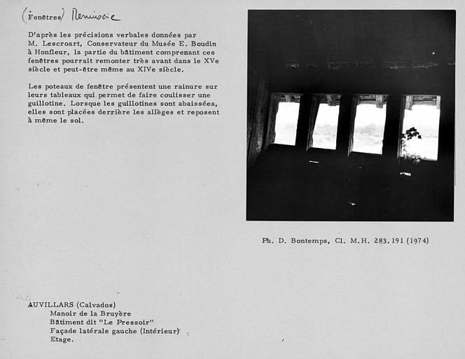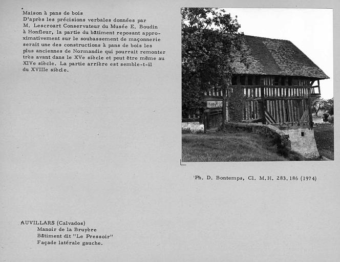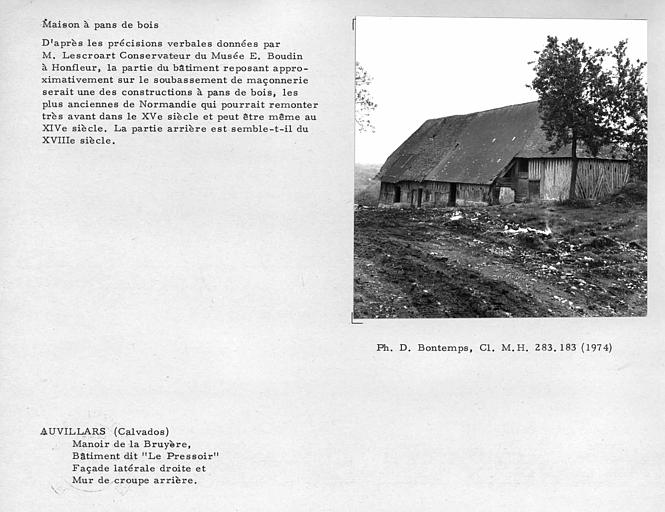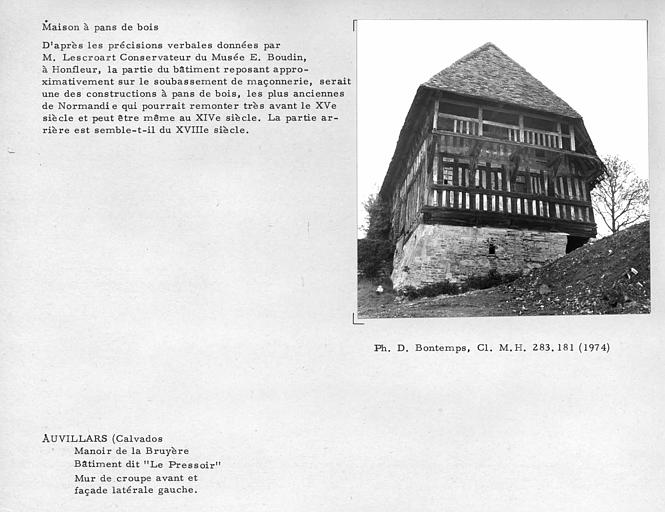 Le pressoir du manoir est un bâtiment de la fin du 15e siècle, dont les deux premières travées est sont élevées sur une cave correspondant sans doute à l'ancien manoir. Il a été converti à la fin du 16e siècle en bâtiment agricole à usage de cave, pressoir et étable. Il abrite le mécanisme de pressoir en rez-de-chaussée, installé à la fin du 18e siècle, surmonté à l'étage de la remise à pommes.