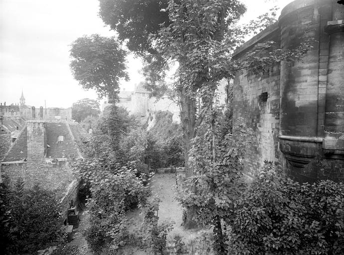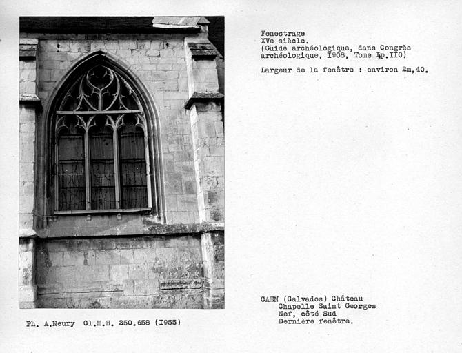 Le château de Caen a été fondé vers 1060 par Guillaume le Conquérant. Le donjon en pierre et la salle de l'Echiquier ont été élevés vers 1120 par Henri Ier Beauclerc, fils de Guillaume le Conquérant. Sous Philippe-Auguste, le donjon a été entouré d'une chemise flanquée de quatre tours circulaires et bordée de fossés. Au 14e siècle a été construit un logis (actuel logis du gouverneur) , remanié aux 16e et 18e siècles. L'église Saint-Georges, du 12e siècle, a été remaniée au 16e siècle (la nef lambrissée a gardé son ossature et ses fenêtres romanes). A partir du 17e siècle, le château a perdu son usage défensif et est devenu un lieu de garnison. Après la Révolution, donjon a été arasé, les fossés comblés et le site affecté à l'armée.