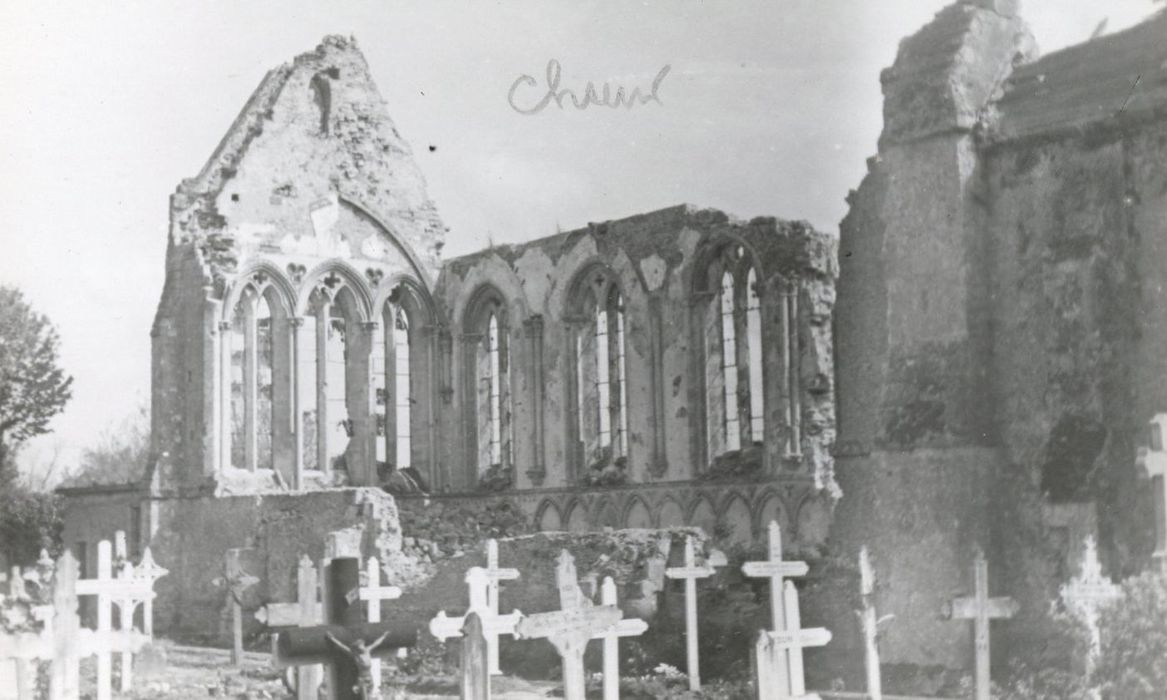 Eglise détruite par faits de guerre. Seul le choeur du 13e siècle subsiste, réintégré dans une nouvelle église.
