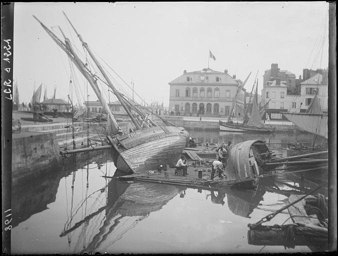 A la fin de l'Ancien Régime, les ingénieurs en charge des travaux de restauration de la commune envisagent de rebâtir, à l'extrémité est du vieux bassin, le vieil édifice que l'on nommait « maison de ville » alors fortement dégradé. La mise en uvre de ce projet fut retardé en raison des évènements de la Révolution. Il fallut attendre 1830 pour que les plans d'un nouvel hôtel de ville, conçus par l'architecte Fontaine soient entérinés. Les travaux s'achevèrent en 1837 sous la direction de l'architecte Hagron.£L'hôtel de ville constitue un exemple représentatif de l'architecture publique de la monarchie de juillet. Il s'agit d'une construction massive, à deux niveaux d'élévation, et d'une grande sobriété. L'escalier suscite un intérêt certain avec sa volée droite à repos et la galerie qui l'entoure soutenue par huit colonnes d'ordre dorique.