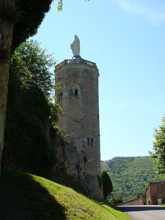 La tour, construite au 12e siècle sur des substructions gallo-romaines, est un des rares vestiges du château détruit à la fin du 16e siècle ; tour donnée en 1647 aux Ursulines, puis après la Révolution aux Visitandines. Statue placée au sommet de la tour entre 1859 et 1862 par le sculpteur Quarre.