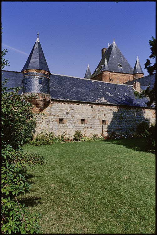 Tour Louis XIII avec tourelles en encorbellement, murs de briques roses avec soubassements en grès, ancrages en fer forgé précisant la date de 1611, époque de la construction par la famille de Maubeuge. Salle des gardes voûtée au rez-de-chaussée. L'aile en brique contiguë date de 1722.