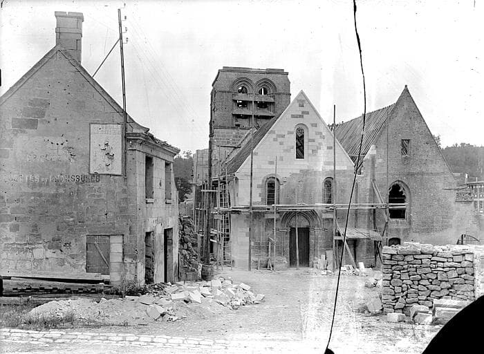 De cette église des 12e, 13e et 16e siècles, il ne subsistait plus après la Première Guerre mondiale que la base du choeur et du clocher et une partie des deux nef accolées.