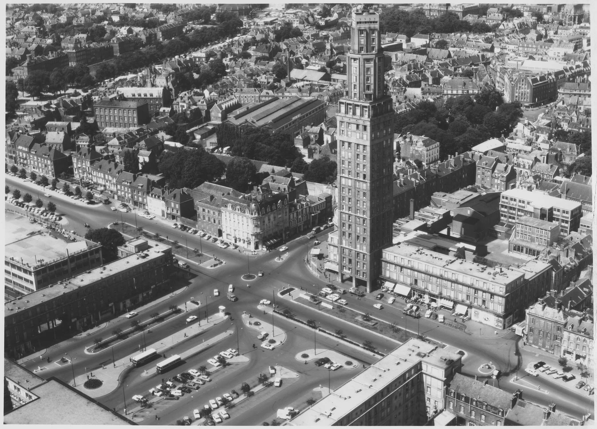 Tour de 103 mètres de hauteur, conçue par l'architecte Auguste Perret en 1942 et construite de 1950 à 1954 dans le cadre de la reconstruction de la place Alphonse-Fiquet. Réalisée en béton armé, la tour, de plan carré, compte 30 étages de logements. A la fois beffroi-campanile, tour-monument et immeuble résidentiel, elle symbolise la reconstruction d'Amiens après la Seconde Guerre mondiale, se détachant sur le profil de la ville à côté de la flèche de la cathédrale.