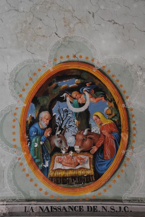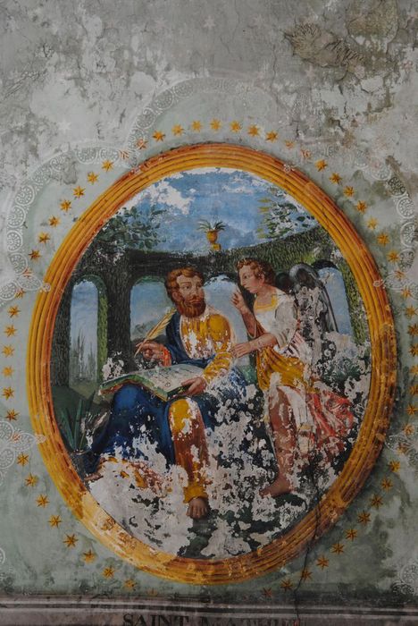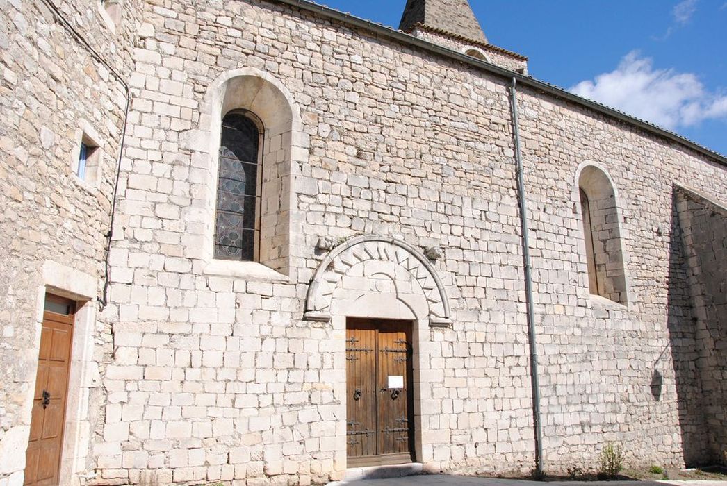 L'année 1652 est gravée sur le tympan. L'église est sans doute une reconstruction à partir d'un édifice peut-être d'origine romane, et de l'ancien château. L'église est bâtie sur les remparts du village, une des tours tenant lieu de clocher. Plan à nef unique et abside à trois pans. A l'intérieur, la nef est voûtée en plein cintre et le choeur est voûté en cul-de-four. Décor intérieur peint datant sans doute du 19e siècle. L'abside est décorée de caissons en trompe-l'oeil en camaïeu bleu-gris ; l'arc triomphal est décoré d'instruments de musique ; et sur la voûte de la nef figurent des médaillons représentant des saints.