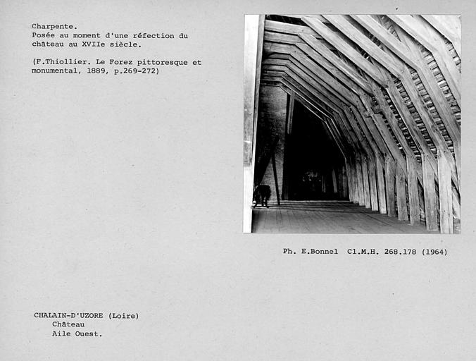 Galerie sur le côté Est de la cour intérieure ; cheminée et porte Renaissance de la grande salle au rez-de-chaussée ; cheminée de la bibliothèque au rez-de-chaussée ; cheminée du petit salon provenant du château de Goutelas, au rez-de-chaussée (cad. A 97) : classement par arrêté du 11 juin 1980 ; Le château de Chalain d'Uzore sis 8 b chemin du château en totalité à l'exclusion des parties déjà classées soit : le logis en totalité, la poterne en totalité, les façades et toitures de tous les communs, les puits, le pigeonnier, les jardins en terrasse avec les serres, les clôtures et leurs portes, le tout, ainsi que les parcelles sur lesquelles le domaine se trouve cadastré section A n° 97, 82, 95, 98, 93 et 94 : inscription par arrêté du 22 juin 2015