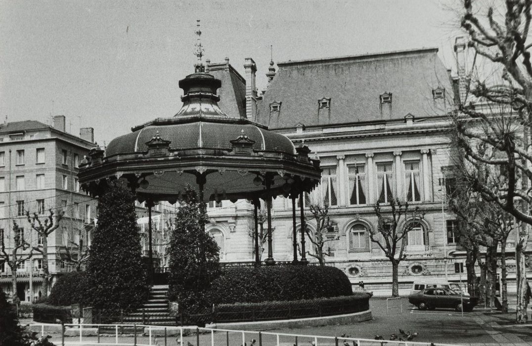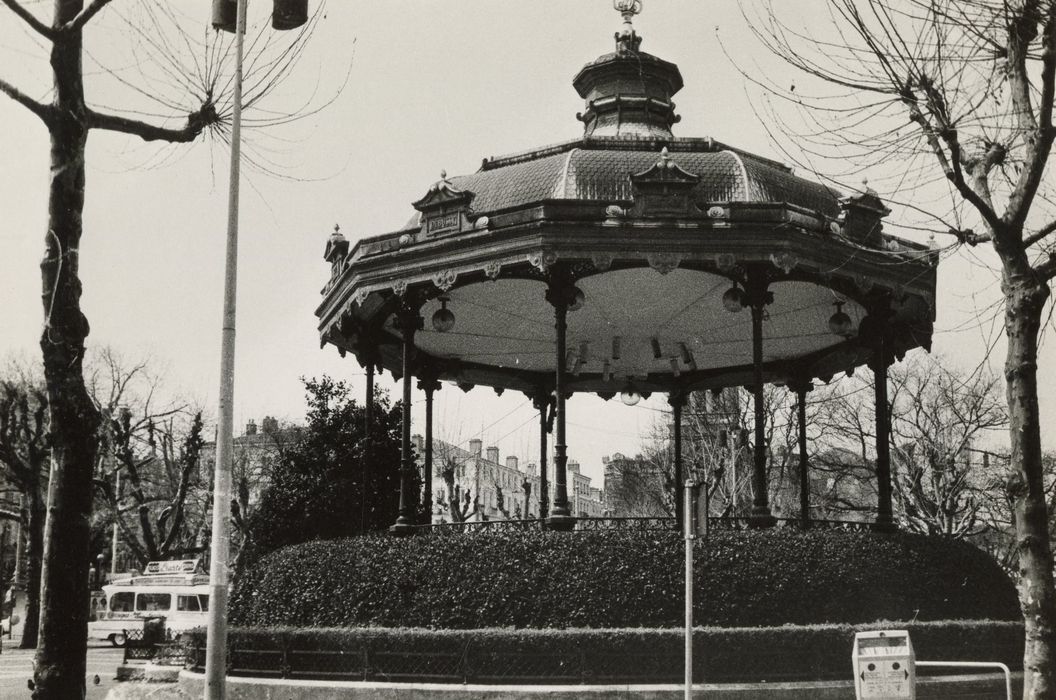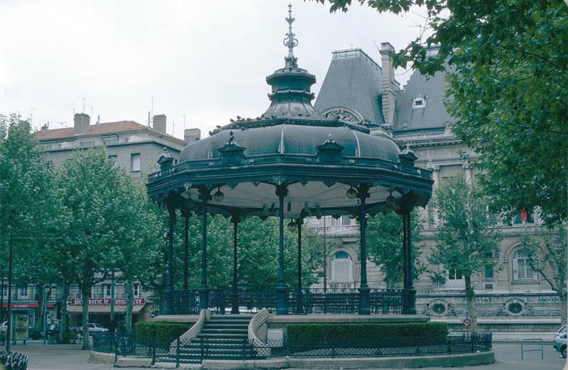 Kiosque à musique construit en 1870 par l'architecte de la ville, Mazerat. Il est entièrement reconstruit en 1914 sur un nouveau soubassement et avec un nouvel escalier d'accès, mais en réemployant tous les éléments en fonte de l'ancien kiosque. Sur chaque face de l'édicule, un cartouche porte le nom d'un compositeur : Ravel, Bizet, Debussy, Saint-Saëns, Massenet, Gounod, Fauré, Berlioz, Lalo et Chabrier.