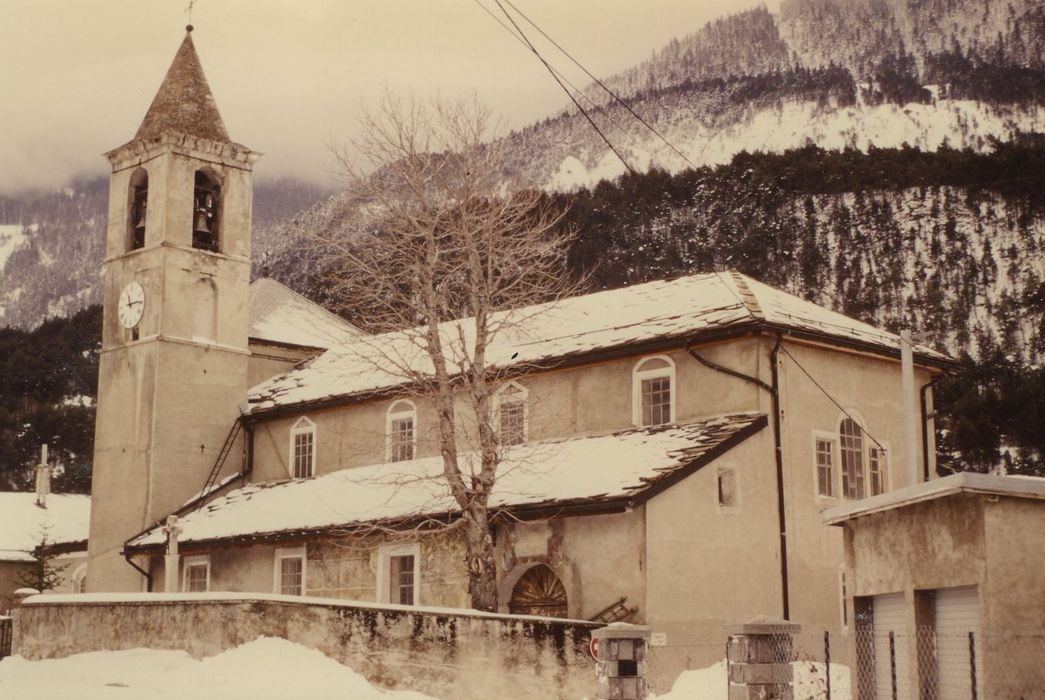 Eglise édifiée sur un plan qui se rattache à la tradition des églises savoyardes de la fin du 17e siècle. Nef de trois travées avec bas-côtés, précédée d'un narthex voûté supportant la tribune. Le choeur, de plan barlong, est éclairé par un lanternon sommé d'une coupole. Depuis le narthex, accès à la crypte qui se prolonge par le caveau. Sur la façade nord, décor peint figurant le cortège des vices et des vertus, vraisemblablement réalisé par l'abbé Damé.
