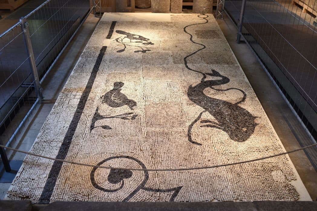 Seul vestige de l'occupation romaine découvert en Haute-Loire. Mosaïque exposée au musée archéologique Michel Pomarat dans la chapelle des Pénitents de Saint-Paulien.