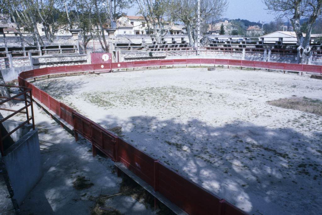 Terrain d'assiette ; barrières délimitant la piste ; bâti structurant l'espace, mur de clôture avec portail, présidence, toril, buvette ; plantation de platanes (cad. A 2066) : inscription par arrêté du 18 janvier 1993