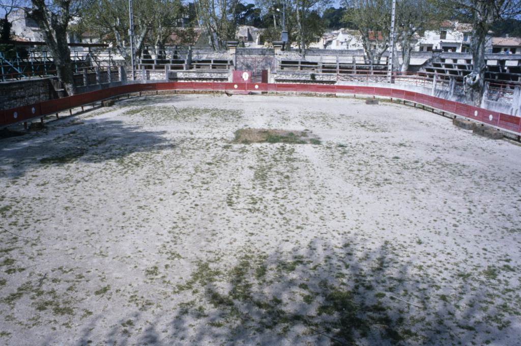 Intérêt ethnologique de la tradition culturelle de la bouvine en Bas Languedoc, utilisée pour les courses de taureaux. Construction en pierre rectangulaire. Gradins en ciment. Galerie "burladero" pour spectateurs debout. Présidence au-dessus du toril. Piste en forme de quadrilatère aux angles arrondis. Quatre platanes à l'intérieur.