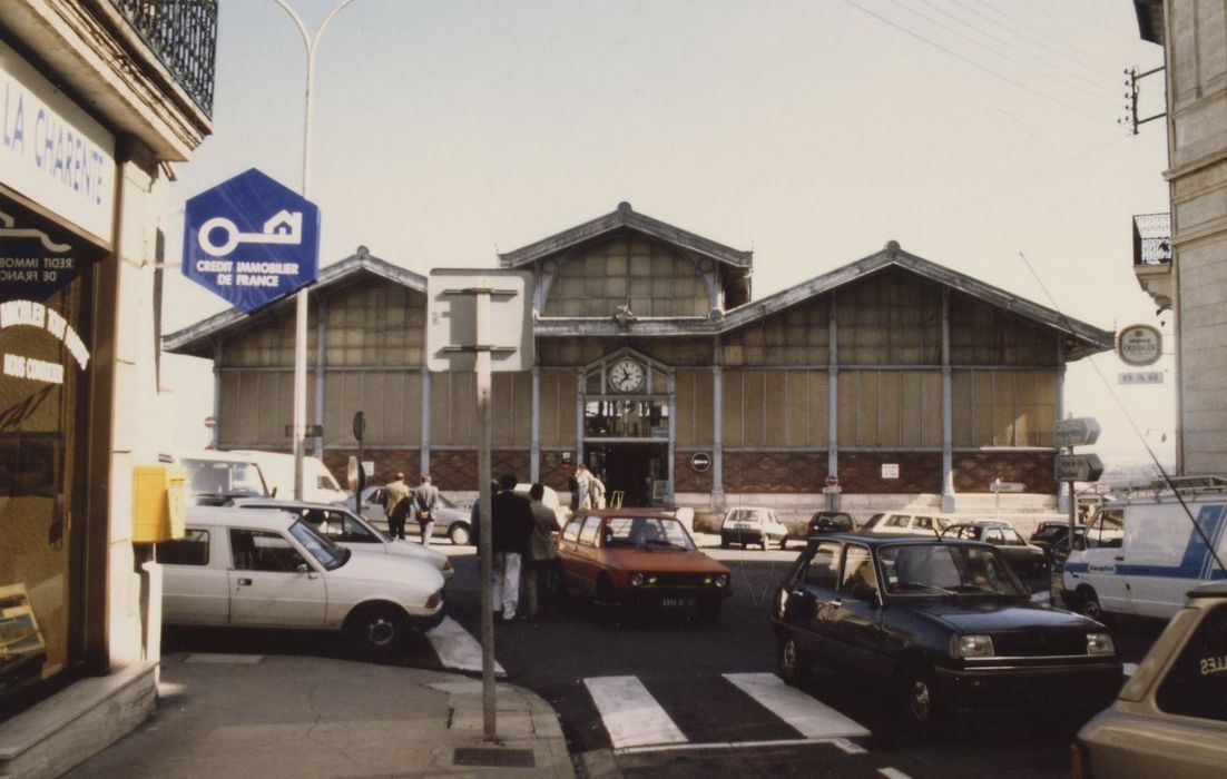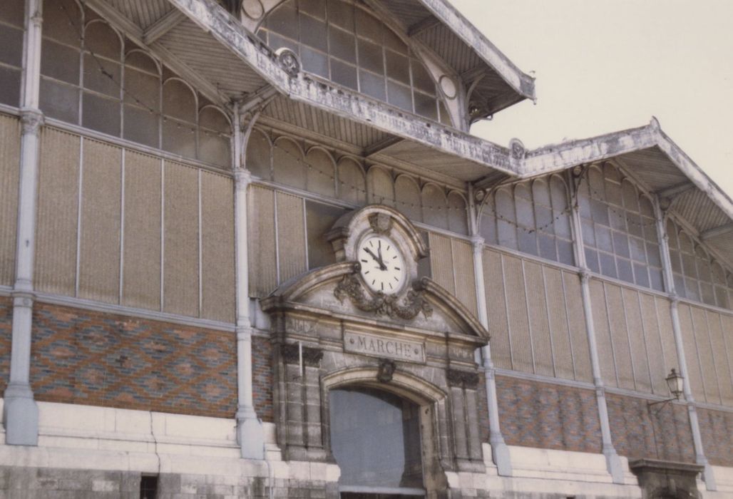 La construction d'un nouveau marché avait été envisagée dès 1859, par suite de l'encombrement du marché en plein air établi devant l'hôtel de ville, et du marché annexe de la place Bouillaud. La construction fut autorisée en 1886, avec percement d'une nouvelle voie d'accès depuis l'hôtel de ville. L'architecte en fut Edouard Varin. La halle se compose d'un double corps de bâtiments inscrits dans un rectangle, disposés autour d'une rue centrale formant lanterneau intérieur. Deux entrées latérales sont placées au milieu des longs côtés, abritées par une marquise portée par deux colonnettes en fonte, et reliées au niveau du sol par une rampe ou un escalier, de façon à rattraper la déclivité du terrain vers le rempart. Le marché comprend ainsi un étage de caves. Le décor se concentre sur la façade principale, avec un portail d'entrée en pierre, surmonté d'une horloge. Une horloge se trouve également sur la façade opposée. les colonnes de section octogonale reposent sur un soubassement en maçonnerie de hauteur variable. Le remplissage des façades est en briques (motif de losanges) en partie inférieure, puis par rideau vitré au-dessus. La partie inférieure du rideau vitré, anciennement dotée de persiennes en bois, a été refaite en 1960 en tôles ondulées de PVC translucide. Une frise en zinc ornée des armoiries de la ville recouvre le chéneau.