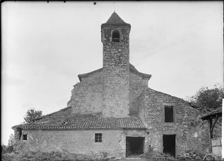 Eglise d'origine romane, mentionnée au 13e siècle, reconstruite au début du 16e siècle par Jean Marre, évêque de Condom, dans un style - nef à contreforts voûtée d'ogives à liernes et tiercerons - encore gothique, mais agrémenté de petites sculptures déjà influencées par la Renaissance (chapiteaux du choeur). En 1541, l'édifice fut doté d'un portail caractéristique de la pénétration en Néracais des modes italianisantes : pilastres à décor de caissons, de losanges et de cercles, chapiteaux corinthiens, niches à coquilles. Un clocher carré, demi hors-oeuvre, ponctue le côté ouest.
