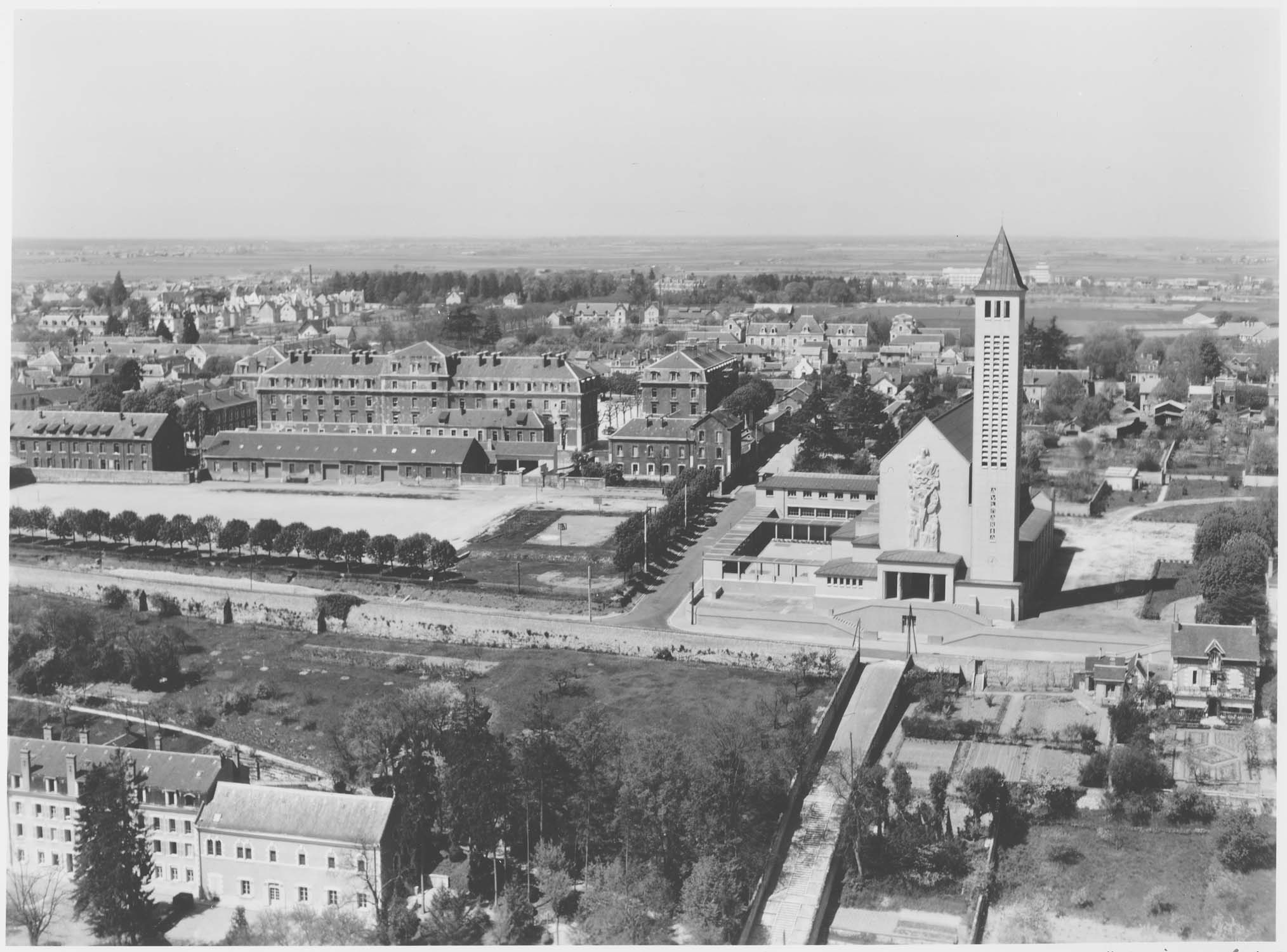 Léglise est commandée en 1931 par larchiconfrérie des Trois Ave et construite à partir de 1934 sous la direction de Charles-Henri Besnard. Les travaux sont interrompus en 1936 et les plans sont repris par larchitecte Paul Rouvière, qui substituera la brique rouge à un revêtement en granit. Après une interruption due à la guerre, laménagement de léglise est repris en mars 1946 par Yves-Marie Froidevaux, architecte en chef des Monuments historiques. Léglise est consacrée le 16 juillet 1949. Représentatif de larchitecture religieuse des années 1930, lédifice est décoré par de nombreux artistes : les sculpteurs Joël et Jean Martel, Jean Lambert-Rucki et André Bizette-Lindet, les tapissiers Jean et Karine Barillet, lorfèvre Jean Puiforcat et les maîtres verriers Louis Barillet, Jacques Le Chevallier et Théodore Hanssen. Devenue un important centre de pèlerinage, léglise prend le titre de basilique (dite mineure) en 1956.