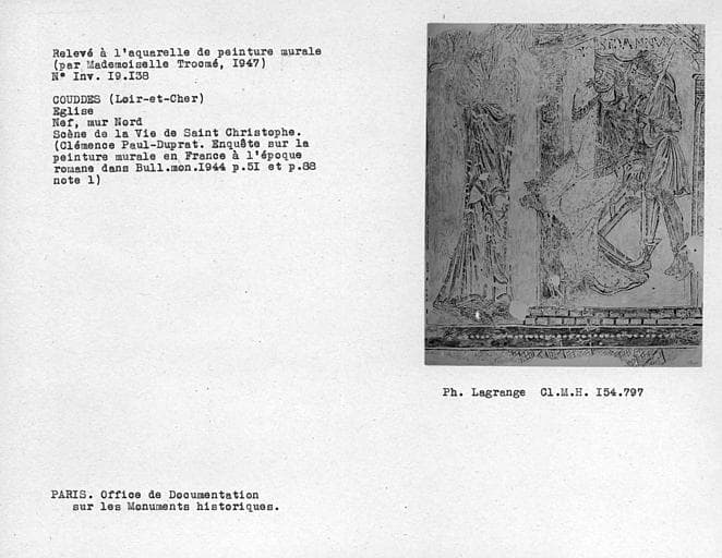 La paroisse devrait sa naissance à l'établissement d'ermites envoyés de l'abbaye de Saint-Martin-de-Tours dès le 5e ou 6e siècle. L'édifice actuel présente, dans les murs de la nef, des restes importants d'un petit appareil qui pourrait remonter au 11e siècle. Au 12e siècle, la porte occidentale a été diminuée de hauteur avec la construction d'un arc. Le choeur et la chapelle seigneuriale ont été édifiés au 16e siècle. A l'intérieur, l'édifice conserve des peintures murales dont la plus ancienne remonte à la fin du 12e siècle, et représente la comparution de Saint-Christophe devant le roi Dannus. Une deuxième campagne de peintures, au 14e siècle, figure le Jugement dernier ainsi qu'une scène avec un chevalier. Au 15e siècle a été peinte la figure monumentale de Saint-Christophe. Au 19e siècle, un décor de pilastres en trompe l'oeil vient recouvrir la partie basse des peintures anciennes.