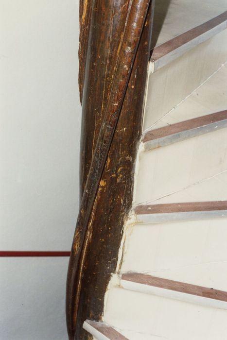 Escalier en vis à noyau nervuré. Structure en pan de bois cachée sous un enduit.