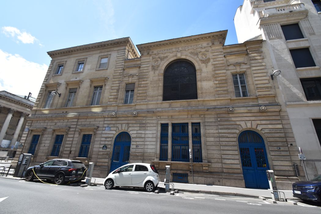 Hôtel construit en 1832 par l'architecte Félix Callet pour les commissaires-priseurs de la Seine. La Chambre de Commerce et d'Industrie de Paris, créée en 1803, s'y installe en 1852. L'édifice est agrandi en 1891 par l'architecte Juste Lisch, avec une nouvelle salle des séances. Le vitrail de cette salle, intitulé "Le Travail, par l'Industrie et le Commerce, enrichit l'Humanité", est dessiné par le peintre Eugène Grasset et réalisé par le maître-verrier Félix Gaudin. Représentant différentes initiatives de la Chambre de Commerce, tel que le port fluvial d'Ivry, il est installé dans l'édifice de la place de la Bourse en novembre 1900, après avoir été exposé au pavillon de la Chambre de Commerce à l'Exposition universelle de 1900.