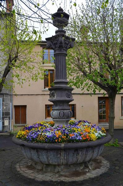 Campagne d'aménagement urbain sous le Second Empire, en 1857-1858 : construction des fontaines (dues à l'architecte clermontois Taché et réalisées par le sculpteur Pierre Béraud) , de l'hôtel de ville...£Cette fontaine présente un décor varié, formé par la superposition d'éléments décoratifs empruntés à l'art romain au travers de la Renaissance. L'ouvrage montre le goût pour l'éclectisme de son créateur, et se veut un témoignage de ce courant, rare dans le Puy-de-Dôme.