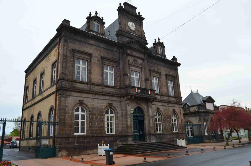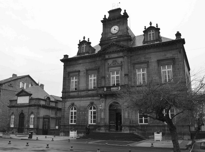 Campagne d'aménagement urbain sous le Second Empire : construction des fontaines (1857-1858) , de l'hôtel de ville (édifice élevé de 1857 à 1861 par l'architecte clermontois Taché).£Cet édifice tranche par la couleur noire de ses façades en pierre de Volvic. La composition symétrique du bâtiment principal encadré de deux annexes de part et d'autre, est assez caractéristique des préoccupations de la fin de l'époque néo-classique. Décor de style néo-Renaissance.