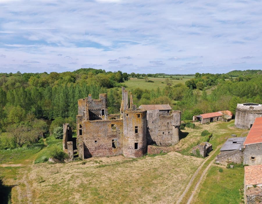 Château signalé au 12e siècle, fortifié en 1386. L'édifice actuel date de la fin du 15e ou du début du 16e siècle. Les bâtiments de communs sont accompagnés d'un pigeonnier de plan circulaire, orné des armes des Vignerot. L'église abrite les gisants en marbre de René de Vignerot et de son épouse Françoise du Plessis de Richelieu, soeur du Cardinal. Exécutés vers 1625 et attribués à Michel II Bourdin. Les parties hautes de la chapelle sont défensives.