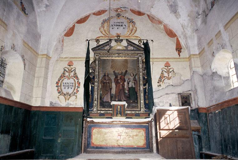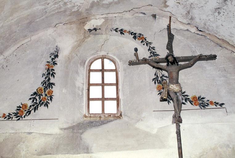 Chapelle attestée au 17e siècle (décor peint du 19e siècle, probablement en 1841). Deux cadrans solaires sont éxécutés sur les murs est et sud en 1718.