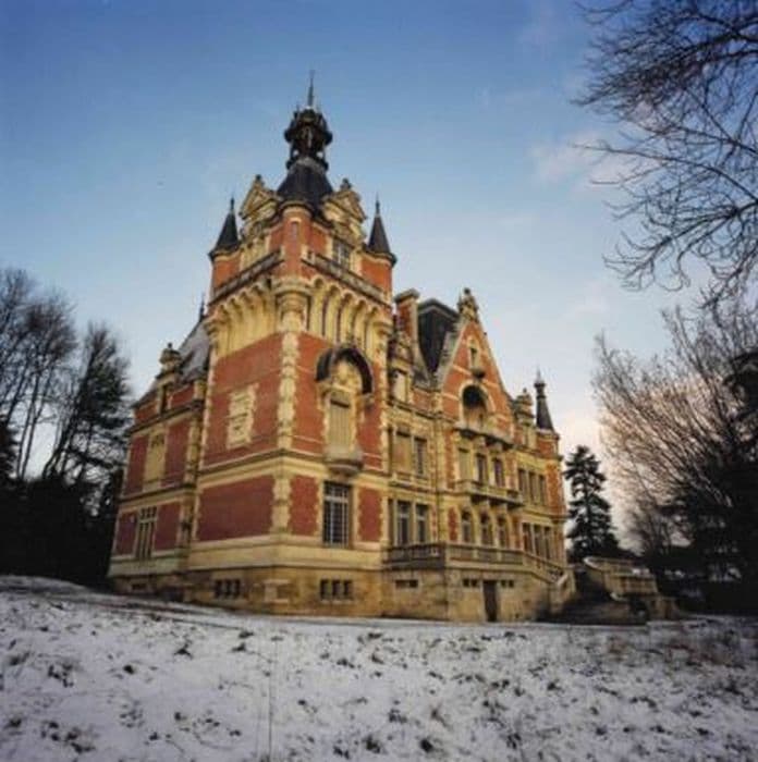 Edifice bâti sur un emplacement utilisé depuis le Moyen Age qui y avait déjà dressé un donjon. Le château actuel, bâti au 19e siècle, remplace un édifice rectangulaire que devait accompagner un parc. La commande fut passée par Etienne Goujon, médecin et sénateur de l'Ain, à l'architecte Tony Ferret. La construction présente quatre faces différentes, alliant symétrie et dissymétrie. L'entrée principale classique, donnant sur le parc, se compose d'un porche avec des décors en applique rappelant les thèmes des 17e et 18e siècles. La façade donnant sur le village est la plus ostentatoire, avec son donjon. Des visages des deux fils d'Etienne Goujon décorent, toujours en applique, l'angle avec la façade nord. La circulation des façades principales était réservée aux propriétaires, tandis que celle des accès latéraux était destinée aux domestiques. A l'intérieur, un vestibule dessert les pièces principales de réception. Au centre se trouve le grand salon, orné de stucs et de médaillons peints. Le salon sud est tendu de soieries. Les boiseries de la bibliothèque sont complétées par une tapisserie. A l'étage, la distribution respecte encore les dispositions d'origine. Le parc conserve son ancienne entrée, un mur d'enceinte avec une tourelle et un bassin, mais a été détérioré par la construction de maisons dans sa partie sud.