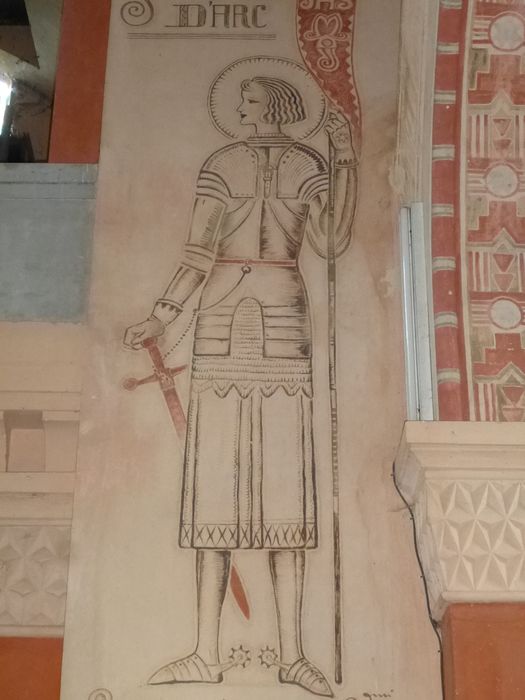 De part et d'autre de l'entrée de l'église, deux figures monumentales très hiératiques, stylisées, traitées en aplat sont figurées. Ce sont saint Martin et Jeanne d'Arc.