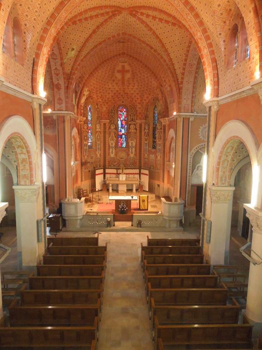 Le décor intérieur est remarquable. Il se développe sur 32 mètres de long, 14 mètres de large et 12.5 mètres de haut. L'église est entièrement recouverte de fresque de Louis Mazetier. L'abside est couverte d'une voûte à trois pans totalement recouverte de motifs décoratifs stylisés denticulés avec en partie sommitale une croix surmontée d'une couronne.