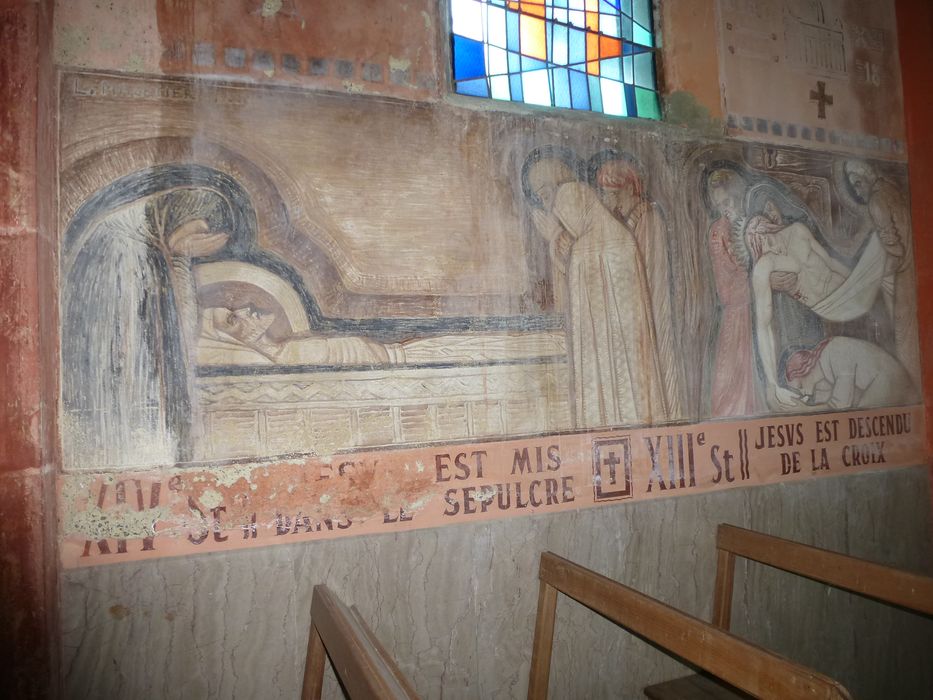 Les murs des bas côtés sont revêtus de 14 stations du Chemin de croix.
