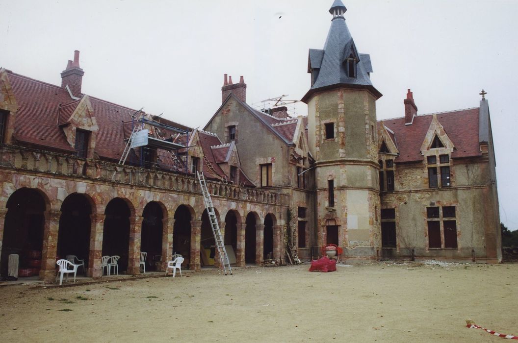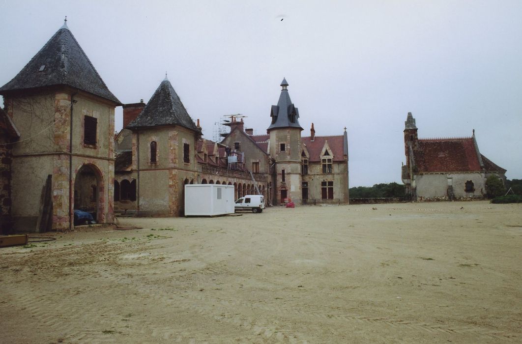 L'ancien château fut le fief d'une seigneurie pouvant être considérée comme l'un des jalons de l'implantation des Bourbons dans la partie orientale de leur territoire. Bâti dans un ravin et entouré d'un étang artificiel, l'édifice était constitué de deux corps de logis en L, flanqués de tours rondes ou carrées et disposés, selon la typologie des châteaux-cours, autour d'une cour fermée par une courtine. Certains détails d'architecture accusent une construction du 14e ou du 15e siècle. Des communs et une chapelle sont édifiés du 16e au 18e siècle, réalisés, comme le château, dans un mélange de grès local ocre et rouge. Un nouveau château est construit au 20e siècle, délimitant ainsi une cour d'honneur. Ce dernier édifice adopte un style éclectique mêlant le néo-gothique au classicisme à l'italienne (galerie à arcades). L'ancien château, aujourd'hui en ruine, a été habité jusqu'à la Révolution.
