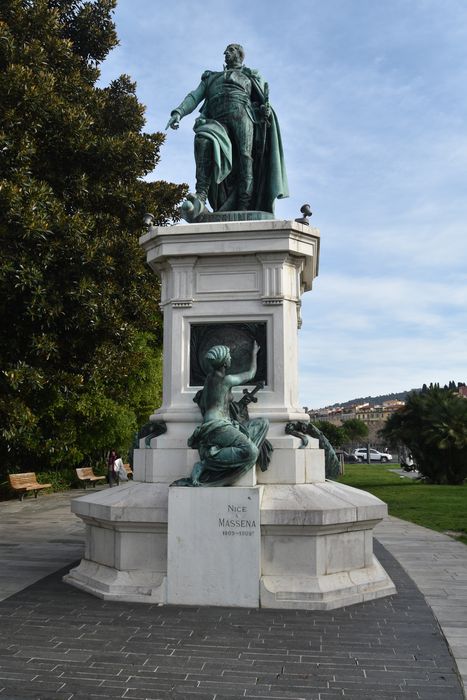 Monument commémoratif au maréchal Masséna, natif de Nice. Projet du sculpteur Carrier-Belleuse, lauréat du concours organisé en 1865. La statue est inaugurée le 15 août 1868. Le maréchal est accompagné d'une victoire écrivant son nom sur le piédestal et de bas-reliefs représentant les batailles de Zürich et de Genês.