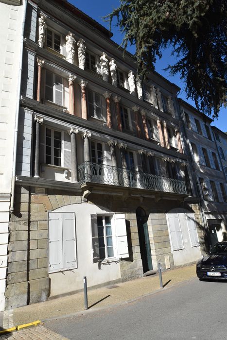 La façade, qui se déploie sur cinq travées, présente une élévation très solennelle et structurée à quatre niveaux. Dans les intérieurs, le décor se limite à des dessus de cheminée en gypserie au décor néoclassique (pilastres surmontés de chapiteaux composites, rinceaux). Les dispositions intérieures paradoxalement, et en contradiction avec le caractère majestueux de la façade, sont conditionnées par l'étroitesse et le plan irrégulier de la parcelle ; l'escalier central, accessible depuis la porte sur rue, dessert à chaque niveau deux pièces éclairées côté rue et aveugles à l'arrière, en fond de parcelle. Parmi les autres exemples de mise en oeuvre des cariatides proposées par le catalogue de Virebent, on peut citer la miasion du 28 rue des Marchands à Toulouse, la façade des Allées Jean-Jaurès à Toulouse, la villa Santa Maria à Bagnères-de-Luchon, le vestibule d'un château dans le Gers, un immeuble situé place Roosevelt à Montauban.