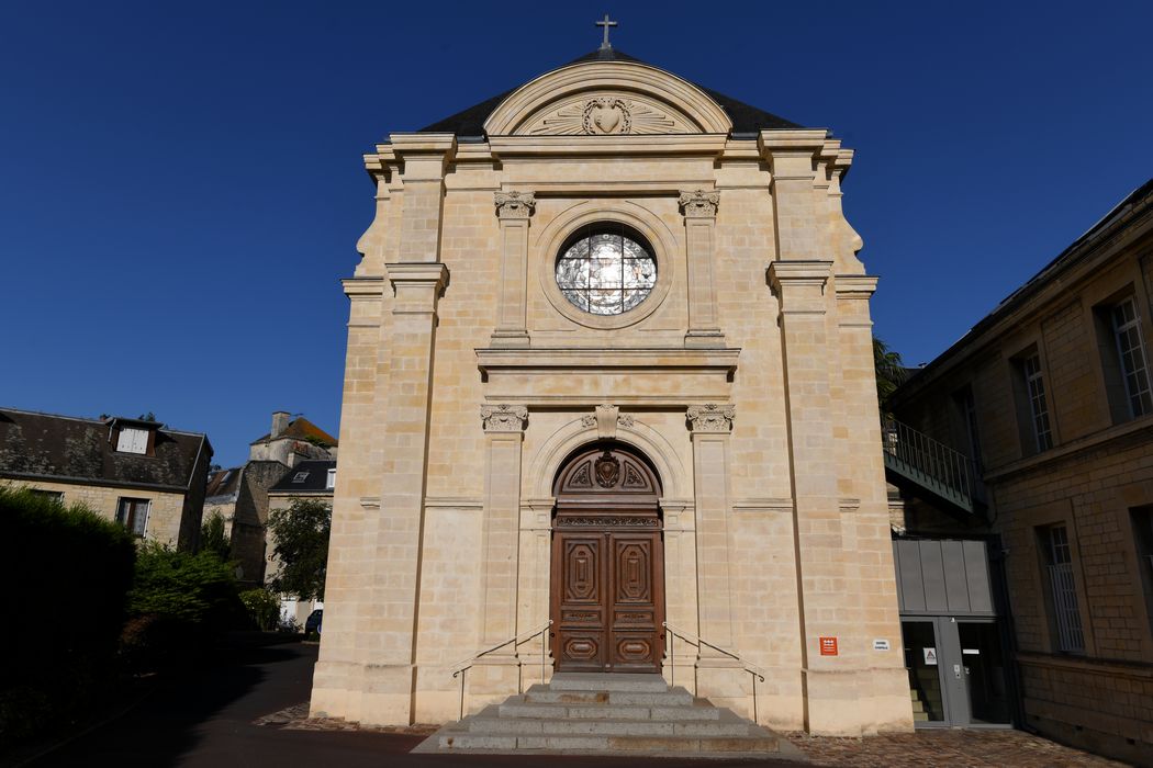 Chassées de leur monastère de la rue Caponière par la Révolution Française, les Visitandines émigrèrent dans l'ancienne maison abbatiale des bénédictins. Elles y élevèrent une chapelle provisoire le 24 juin 1812, et entreprirent la construction d'une nouvelle chapelle le 13 avril 1833, bénite le 19 février 1838. En 1889, un legs dû à Louise de Vendes permit d'envisager la construction de la troisième chapelle. La conception architecturale est due à l'abbé Esnault, aumônier du monastère, mais l'architecte est le caennais Edmond Hébert. Toutefois, les archives de la communauté conservent deux plans projets portant la signature de Rapine, architecte des Monuments Historiques, que l'on retrouve par ailleurs comme concepteur du monastère des Visitandines à Orléans. Le 28 mai 1890, plans et devis sont soumis à l'autorité épiscopale. Les travaux de fondation débutent le 21 juin 1890 et la première pierre est bénite par l'évêque de Bayeux le 19 mai 1891. La chapelle achevée est bénite le 25 septembre 1892 et la consécration a lieu le 17 octobre 1893. Le sol présente des motifs géométriques en marbre. Le chemin de croix est dû à l'atelier Jacquier. Les verrières sont l'oeuvre de l'atelier Lorin à Chartres (réalisées entre 1900 et 1924).