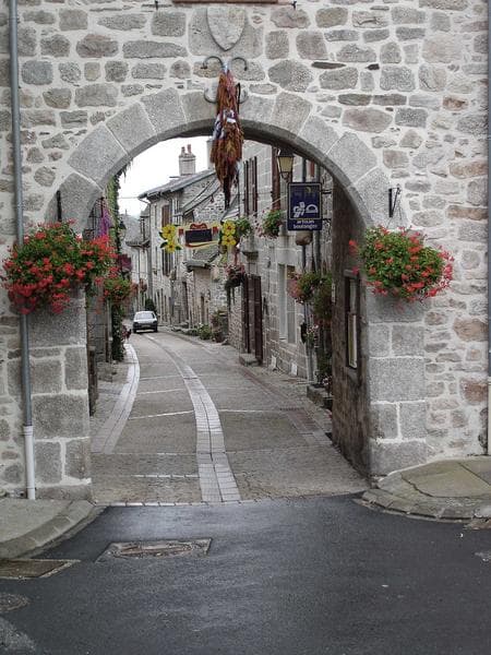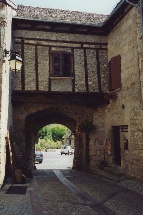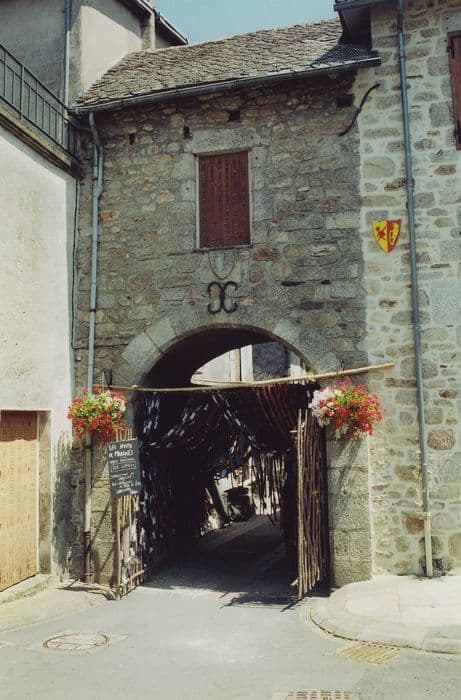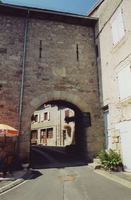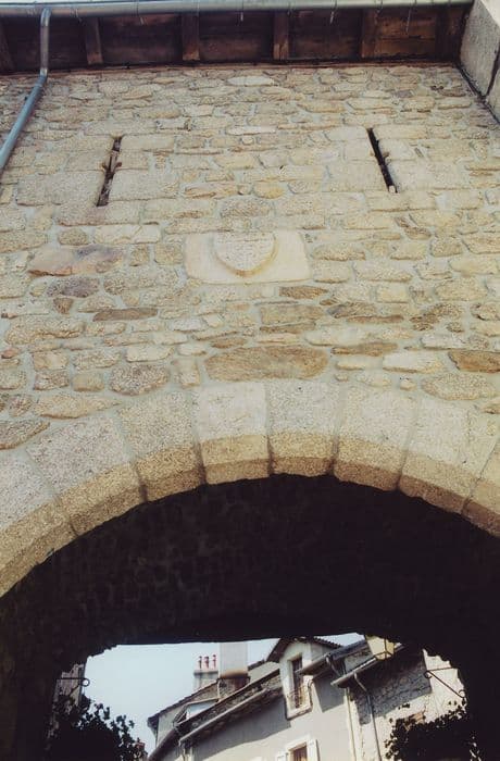 La ville était entourée au Moyen Age d'une enceinte fortifiée dont elle conserve le tracé ainsi que deux portes de ville. Le portail haut (ouest) a été reconstruit au 19e siècle. Le portail bas (est) a conservé l'essentiel de ses dispositions médiévales : passage voûté en berceau, rainure destinée au mouvement de la herse, façade défendue par des archères cruciformes et ornée d'un blason aux armes de la famille Boisset (15e siècle).