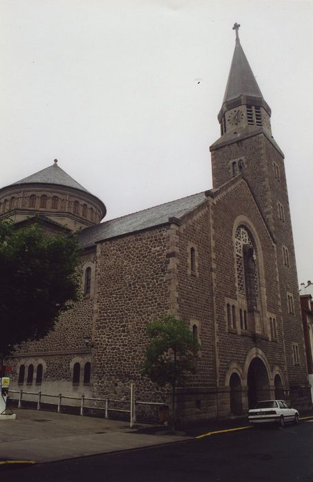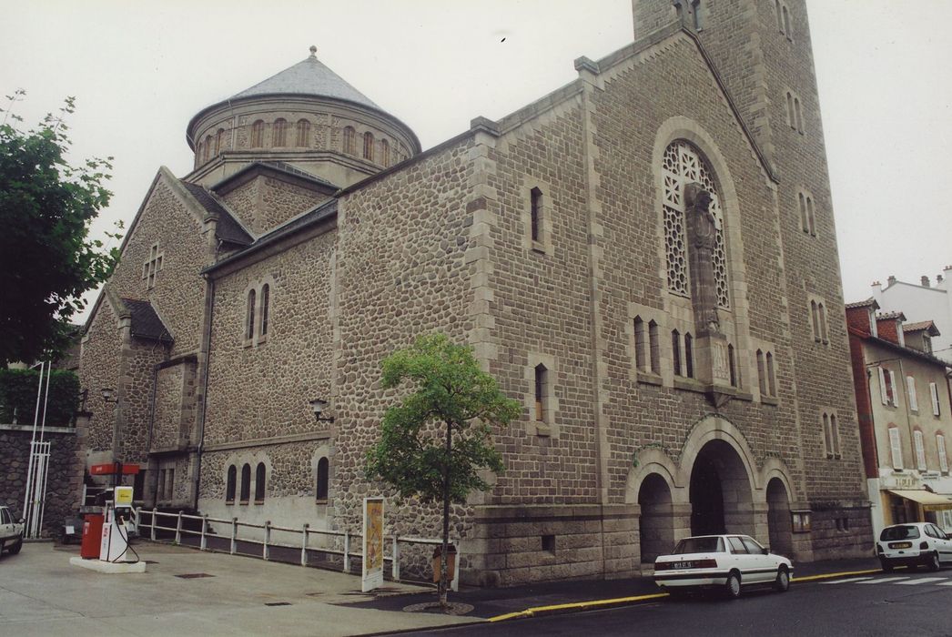 Eglise construite en 1937 selon le projet de l'architecte Pierre Croizet qui adopte un style néo-roman rationaliste. Plus particulièrement inspirée par le style périgourdin (voûte à coupole sur pendentif) , elle comprend une église basse surmontée d'une église haute à nef unique et large, couverte d'une coupole au niveau du faux transept. Le clocher carré est accolé à la façade sud, elle-même ornée d'une statue monumentale du Christ, réalisée par le sculpteur Georges Bigeard. Sa mise en uvre mêle matériaux traditionnels (granit, pierre de Murat) et techniques modernes (béton armé). Le programme décoratif s'ouvre à l'art moderne : vitraux figuratifs et abstraits de Marguerite Huré ; bas-reliefs du sculpteur C. Bouscau ; peintures et mosaïques des ateliers Mauméjean.