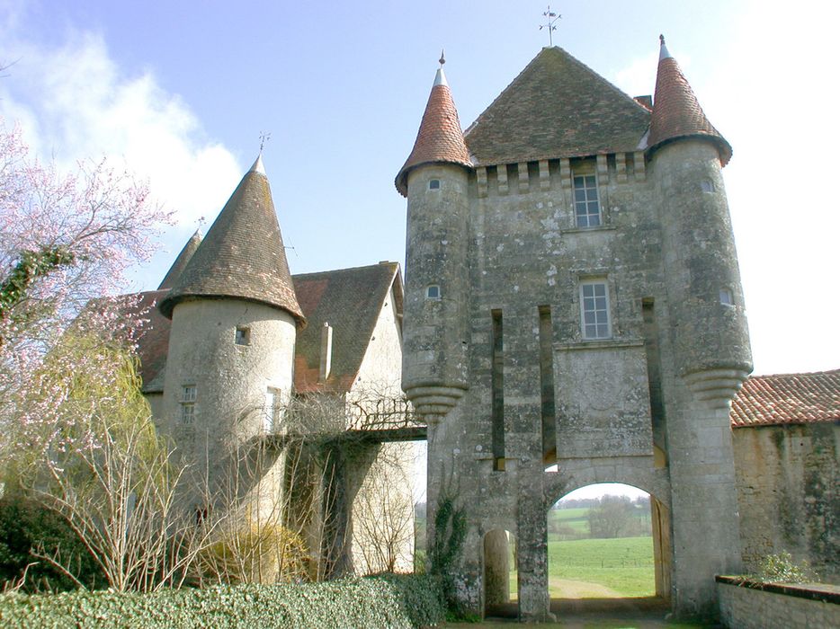 Le châtelet d'entrée en totalité, y compris sa passerelle d'accès, les façades et toitures du logis y compris la tour en ruine, ainsi que les façades et toitures des deux ailes des communs (cad. H 327) : inscription par arrêté du 14 octobre 2002