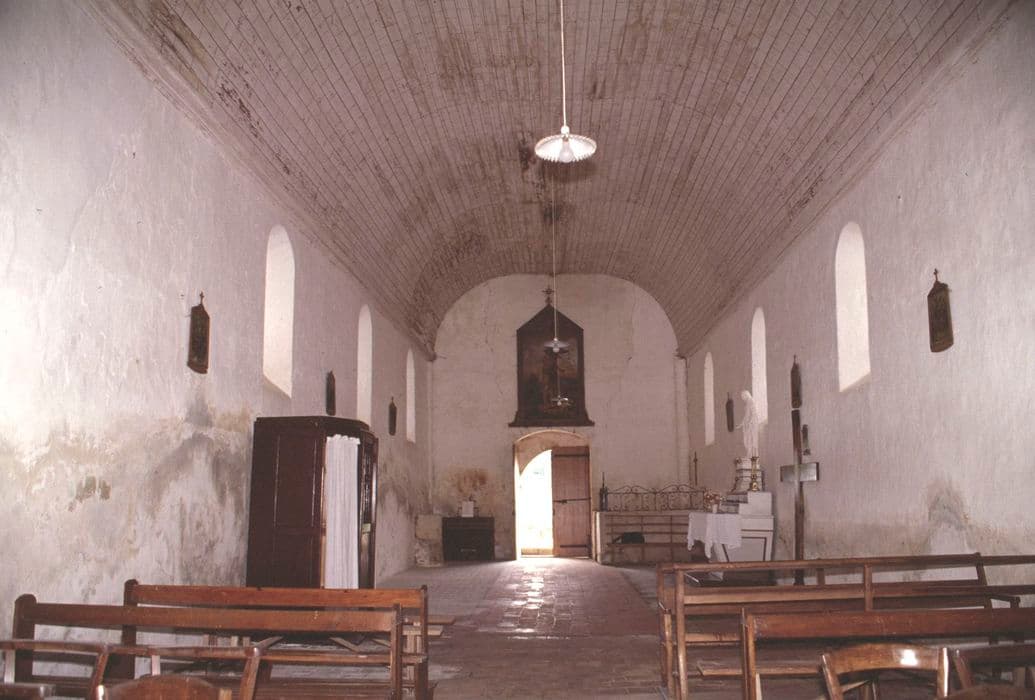 Long vaisseau rectangulaire (35 x 8 mètres), ses parties les plus anciennes ne semblent pas remonter avant le 13e siècle (chœur et carré de l'ancien clocher, effondré en 1765). L'édifice a été plusieurs fois remanié : construction de la façade et remontage des murs latéraux du chœur à la fin du Moyen Âge, reconstruction des murs de la nef vers 1750. Quelques travaux sont réalisés au 19e siècle : petit clocher au-dessus de l'ancienne tour d'escalier (1831), voûte en brique du chœur (1872) puis du carré (1891, en même temps que les piliers et l'arc triomphal), lambris en berceau de la nef (1891). La façade, simple, est dotée d'un portail en arc brisé, à voussures chanfreinées retombant sur des colonnettes à chapiteaux épannelés ; elle est encadrée de gros contreforts surmontés d'échauguettes à mâchicoulis. La nef a des murs gouttereaux en moellons avec petites baies plein-cintre et sa rare charpente à liernes (16-17e siècle ?), masquée par le tillis, présente plusieurs fermes ouvragées (bagues et pointes de diamant sur les poinçons et les entraits, arbalétriers délardés en arceaux, gravure de traits, d'une roue et d'un outil semblable à un départoir). Le chevet plat présente un triplet de lancettes délicatement ornées, à l'extérieur comme à l'intérieur : voussure torique et colonnette à chapiteaux feuillagés, archivolte de feuilles sur culot historié (personnages ou animaux). Les mêmes baies se voient dans l'ancien carré. A l'intérieur, les murs latéraux du chœur présentent des grands panneaux de peintures murales encore en partie recouvertes de badigeon. Elles représentent le martyre de saint Jean-Baptiste (mur Nord) et une série de saints en pieds, dont saint Pierre avec ses clefs (mur Sud).