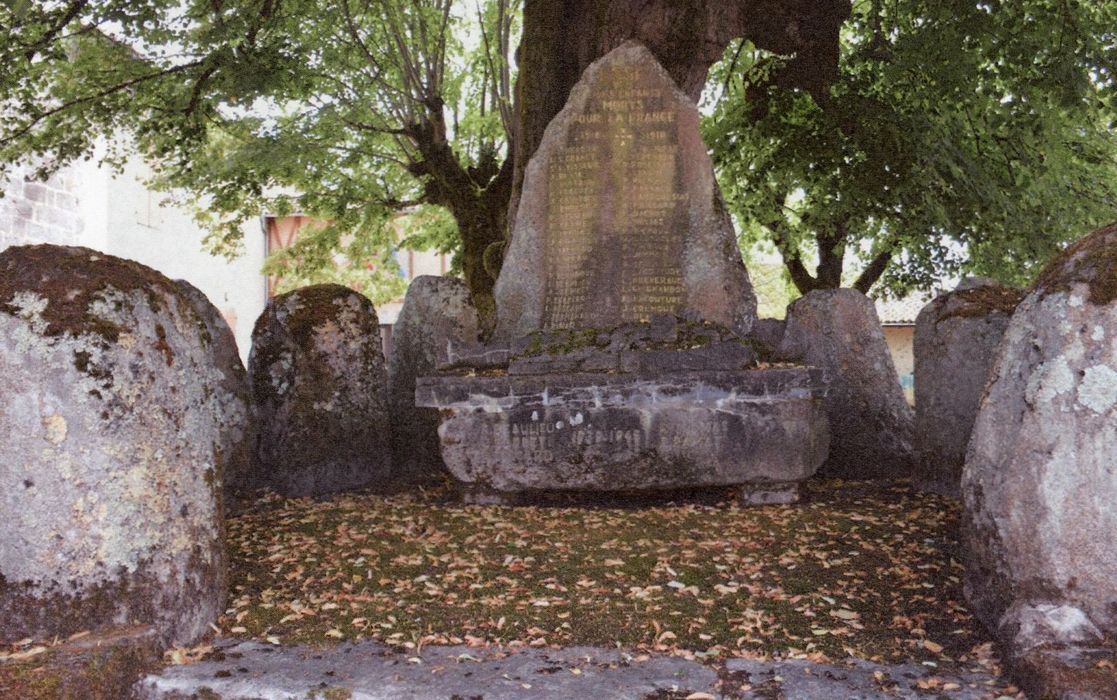 La construction de ce monument singulier s'est faite sous l'égide du peintre et folkloriste Jean Teilliet (1870 - 1931), élève des Arts décoratifs de Limoges puis des Beaux-Arts de Paris. Profondément attaché à la culture populaire limousine, il a notamment oeuvré pour la création de groupes folkloriques et est à l'origine de l'association « les limousins de Paris ». Jean Teilliet connaît bien le pays et c'est donc naturellement qu'il choisit de réutiliser, pour la stèle, un morceau de la dalle de couverture d'un dolmen brisé sis à Périssac. Loin d'être conscient d'un acte de vandalisme et de pillage archéologique, Jean Teilliet justifie la réutilisation, à la fois du "banc des morts" et du dolmen, par le texte gravé à droite de l'emmarchement : "[...] sur ce banc des morts [...] est déposée l'image de nos chers enfants morts pour la France. [...] leurs noms sont gravés profondément sur un menhir de granit dominant le cromlech de blocs rustiques, enceinte sacrée de nos premiers ancêtres".