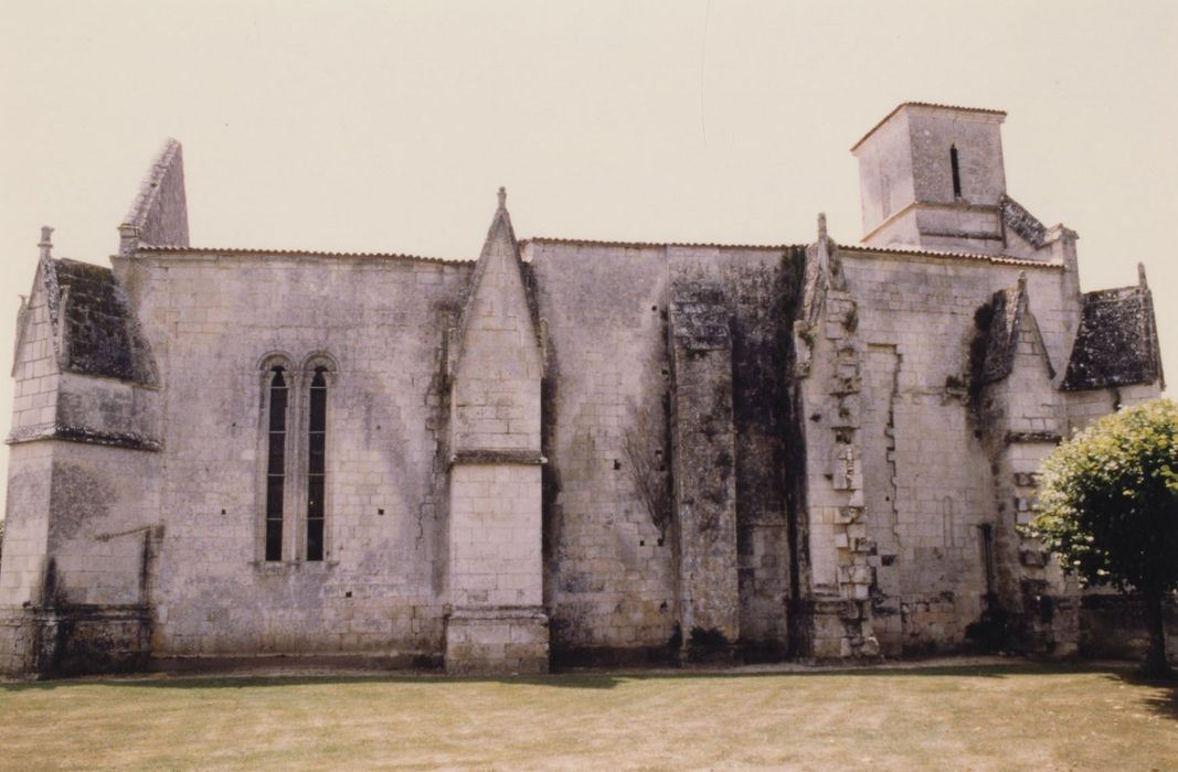 Edifice d'origine romane. Au 13e siècle, il reçoit un chevet plat et des voûtes d'ogives disparues, dont il subsiste des vestiges dans les combles. Probablement ruiné pendant la guerre de Cent ans, l'édifice est reconstruit dans le courant du 15e siècle. Il se présente comme un rectangle épaulé, sur chaque angle et sur les longs côtés, par de puissants contreforts. La façade s'ouvre par un portail gothique flamboyant, avec archivolte à crochets et fleurons, et son pignon est couronné par un petit clocher quadrangulaire. Baies en arc brisé, à remplage flamboyant. Le mur nord est représentatif des trois étapes de construction de l'édifice : la travée ouest est en partie romane, celle de l'est date du 13e siècle et la médiane du 15e siècle. A cette dernière époque, une chapelle gothique était prévue de ce côté, mais n'a jamais été terminée. Au revers de la façade, le clocher a nécessité la construction de puissants massifs entre lesquels prend place une tribune couverte d'une voûte barlongue percée d'un large oculus. En Saintonge où les églises romanes sont majoritaires, cette église est l'un des exemples peu fréquents de construction gothique aboutie.