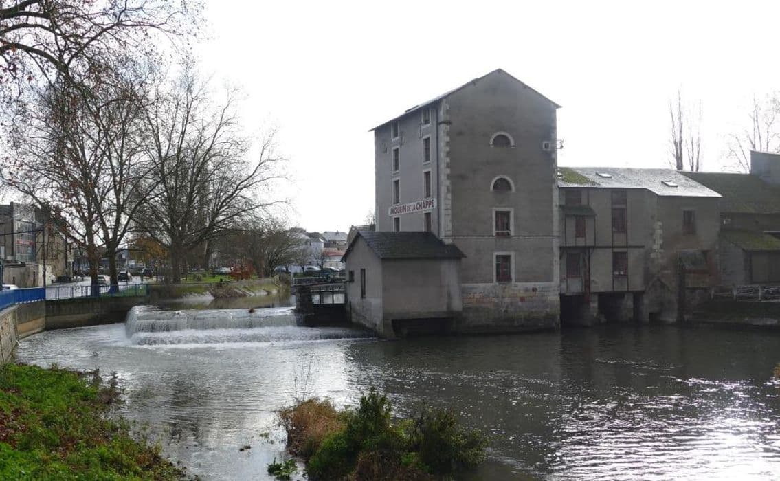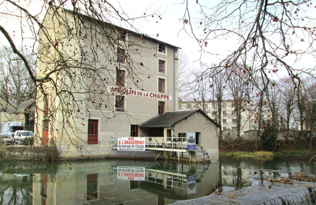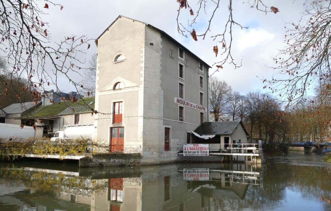 L'existence du moulin de la Chappe est attestée en 1241 sous l'appellation de « Charasse » ou « Charosses » car il était situé sur une voie romaine carrossable, recouverte d'une chape, qui franchissait la rivière « Auron » à cet endroit, par un pont aujourd'hui disparu. L'Auron s'écoule dans un environnement essentiellement agricole, depuis sa source dans le département de l'Allier jusqu'à sa confluence avec l'Yèvre, au niveau de Bourges. Dans la cité, l'Auron faisait mouvoir quatre moulins dont celui de la Chappe qui est aujourd'hui le seul en activité. Après avoir subi une inondation, le moulin fut reconstruit en 1428, par ses propriétaires, les chanoines de la Sainte-Chapelle de Bourges, comme étant aux droits de l'ancienne abbaye de Saint-Hippolyte de Bourges. L'une des vannes par lesquelles le moulin contrôlait le courant qui alimentait la roue, porte la date de 1441. Le chapitre de la Sainte-Chapelle demeura propriétaire du moulin jusqu'à sa vente comme bien national en 1792. Vers 1560, la gravure de Joris Hoefnagel représente, établi au milieu de l'Auron, le moulin de la Chappe et le pont qui, rive droite, le reliait à la cité près de la porte de la Chappe, et, rive gauche, aboutissait à des chemins qui traversaient des prairies. Un second pont franchissait la rivière un peu plus en en aval, à l'emplacement actuel du pont d'Auron, face à la porte du même nom qui était l'entrée sud de la ville. Sur les plans et les vues de Bourges des XVIe et XVIIe siècles, le moulin de la Chappe semble n'être constitué que d'un seul bâtiment. C'est sur ses fondations que repose la plus élevée des constructions qui composent aujourd'hui le moulin. Sur le plan cadastral de 1814, à l'emplacement de l'ancien pont disparu vers 1700, une nouvelle construction abrite la roue. Au XIXe siècle, « l'usine » était mise en mouvement par une roue hydraulique qui prenait l'eau par-dessus. Des pales de bois étaient fixées sur une armature métallique. La roue encore en place mais en mauvais état est à l'arrêt depuis 1973. La minoterie toujours en activité est mue par l'électricité. Au XVIIIe siècle, entre le bâtiment du moulin et la rive droite, ont été construits un radier en équerre, constitué de dalles de pierres et un pont qui reliait le moulin à la ville. Un déversoir bâti en 1818, haussé en 1828 puis entièrement reconstruit en béton en 1873, fut posé sur le radier. La rivière qui s'élargit légèrement devant le barrage, y retombe 1,20 m ou 1,40 m plus bas selon les étiages. La traversée de Bourges par le canal de Berry en 1832 et la création d'un port de marchandises modifièrent les lieux. Le site du moulin de la Chappe fut utilisé pour maintenir la retenue des eaux nécessaires à l'alimentation du canal de Berry. Les eaux venant d'amont se fondent dans un bassin aux berges en parement perré, créé en 1864. Dans cette « râcle », les eaux sont distribuées entre le canal et le bras de la rivière qui fait tourner le moulin. Le fonctionnement de l'usine se trouve subordonné aux besoins de la navigation qui doit être satisfaite avant lui. Le canal qui a participé à l'industrialisation du quartier, fut déclassé en 1955 et en partie comblé en 1976. Le corps de bâtiment principal, construit sur les bases de celui du XIIIe siècle, abrite les mécanismes et la minoterie. Il a été surélevé une première fois vers 1910 et une seconde en 1928. Au-dessus d'un rez-de-chaussée où sont les mécanismes liés à la roue, il s'élève sur quatre niveaux. A la suite du corps de bâtiment principal, du côté de la rive gauche, se trouve une seconde construction. Elle a conservé une trompe d'angle en pierre d'appareil, qui témoigne d'une certaine recherche de stéréotomie, et un contrefort visible sur une gravure de 1851. Au-dessus de la trompe, une inscription garde le nom du maçon Dardeau et la date 1776. Sous ce corps de bâtiment reconstruit en 1879-1880, s'ouvrent les voies des cinq vannes de décharge. Une sixième est placée entre la voie de la roue motrice et le déversoir. En 1876, fut créé un exutoire reliant l'Auron en aval du moulin de la Chappe, au canal de Berry en aval de l'écluse de la Chappe. Il servit à alimenter le canal de Berry en eau.