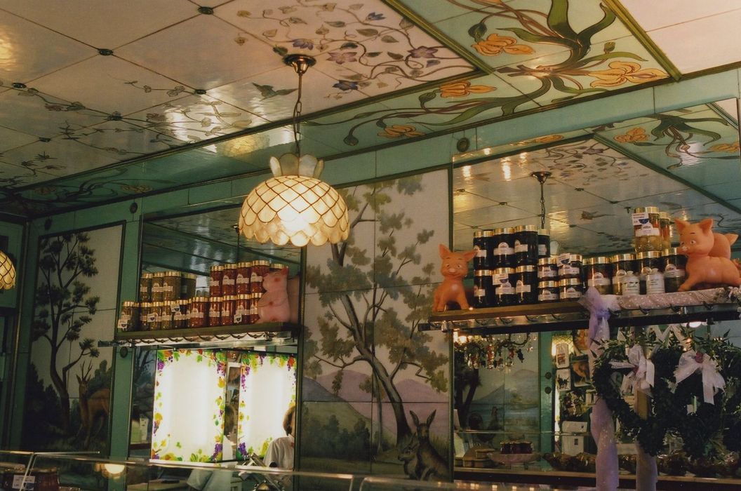La charcuterie présente un décor de carreaux d'opaline peinte exécuté en 1907 par la famille Beyer, maîtres-verriers à Besançon. Les panneaux représentent des paysages et des animaux. Le plafond s'orne de branches de fleurs et d'oiseaux. Ce décor est quasiment unique en Bourgogne.
